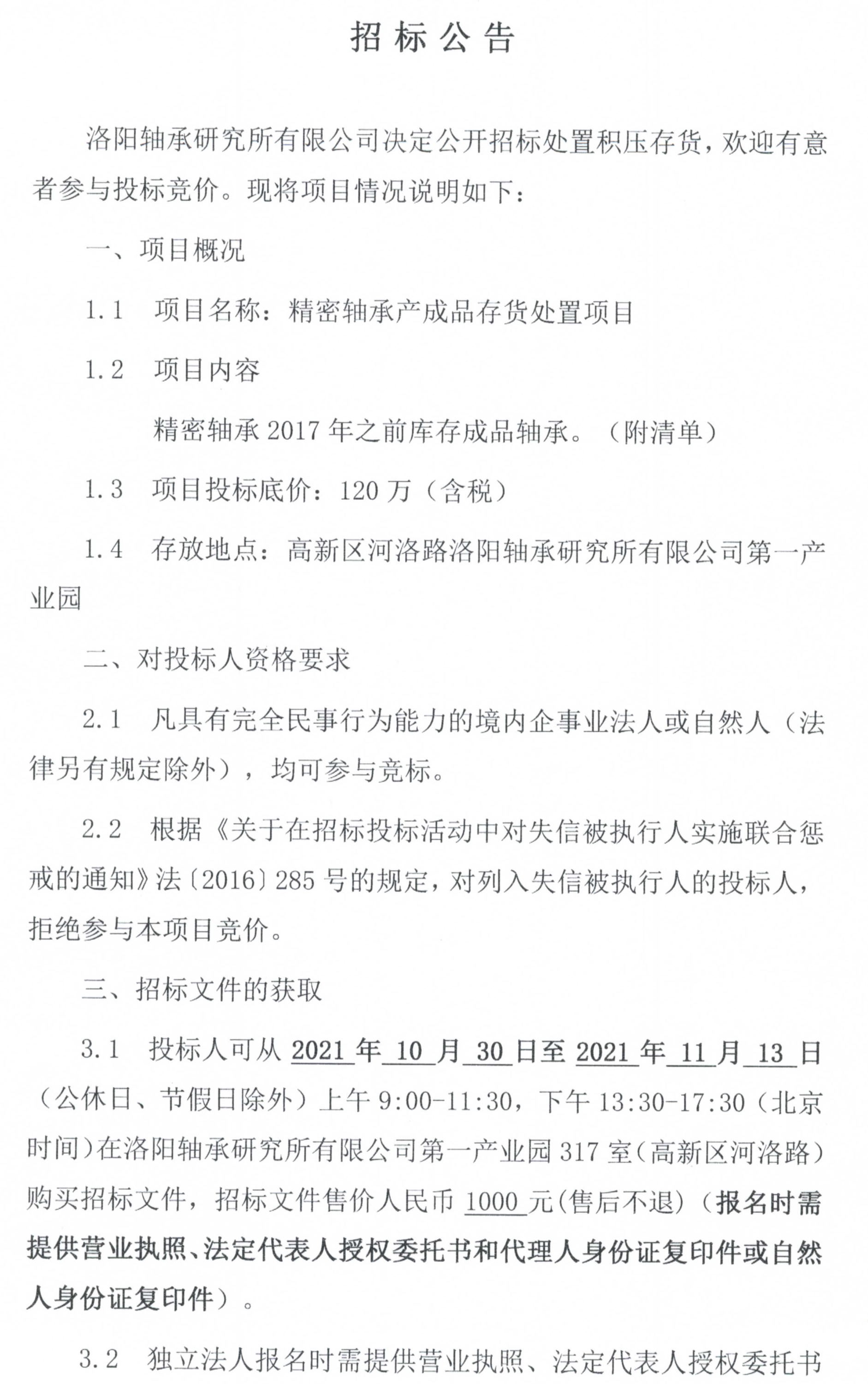 精密U8国际轴承半成品存货处置项目招标公告
