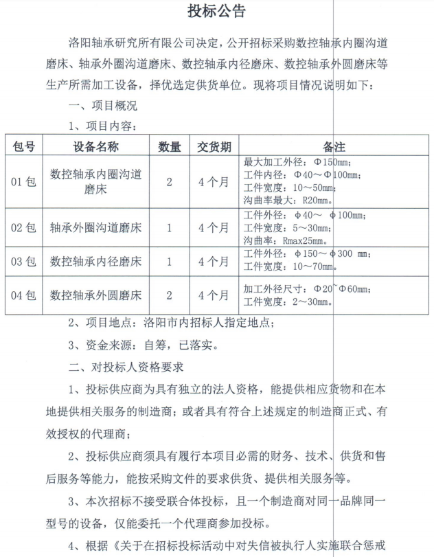 磨床、超精机、数控车床等设备采购招标公告