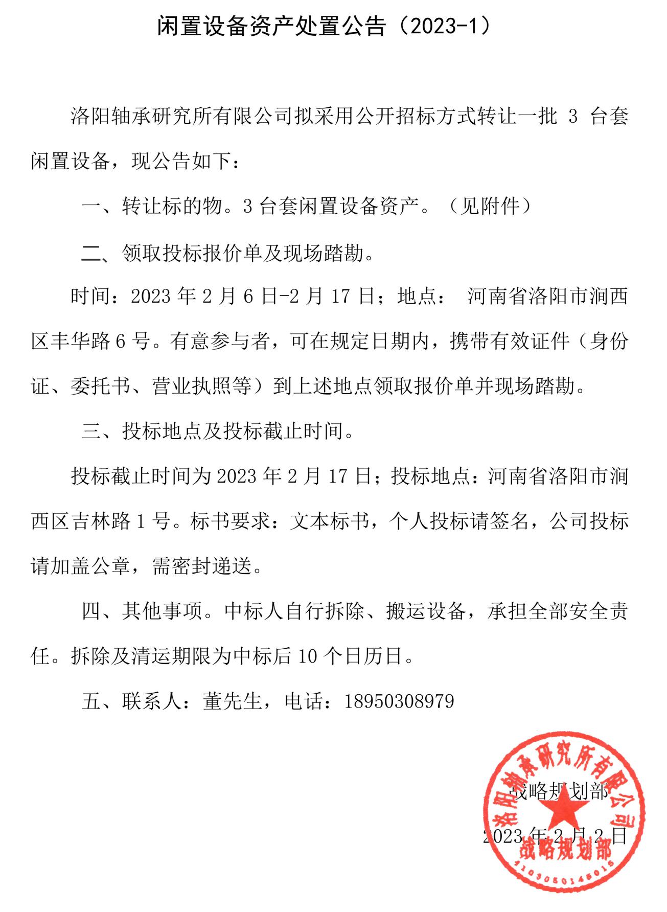 闲置设备资产处置公告(2023-2)