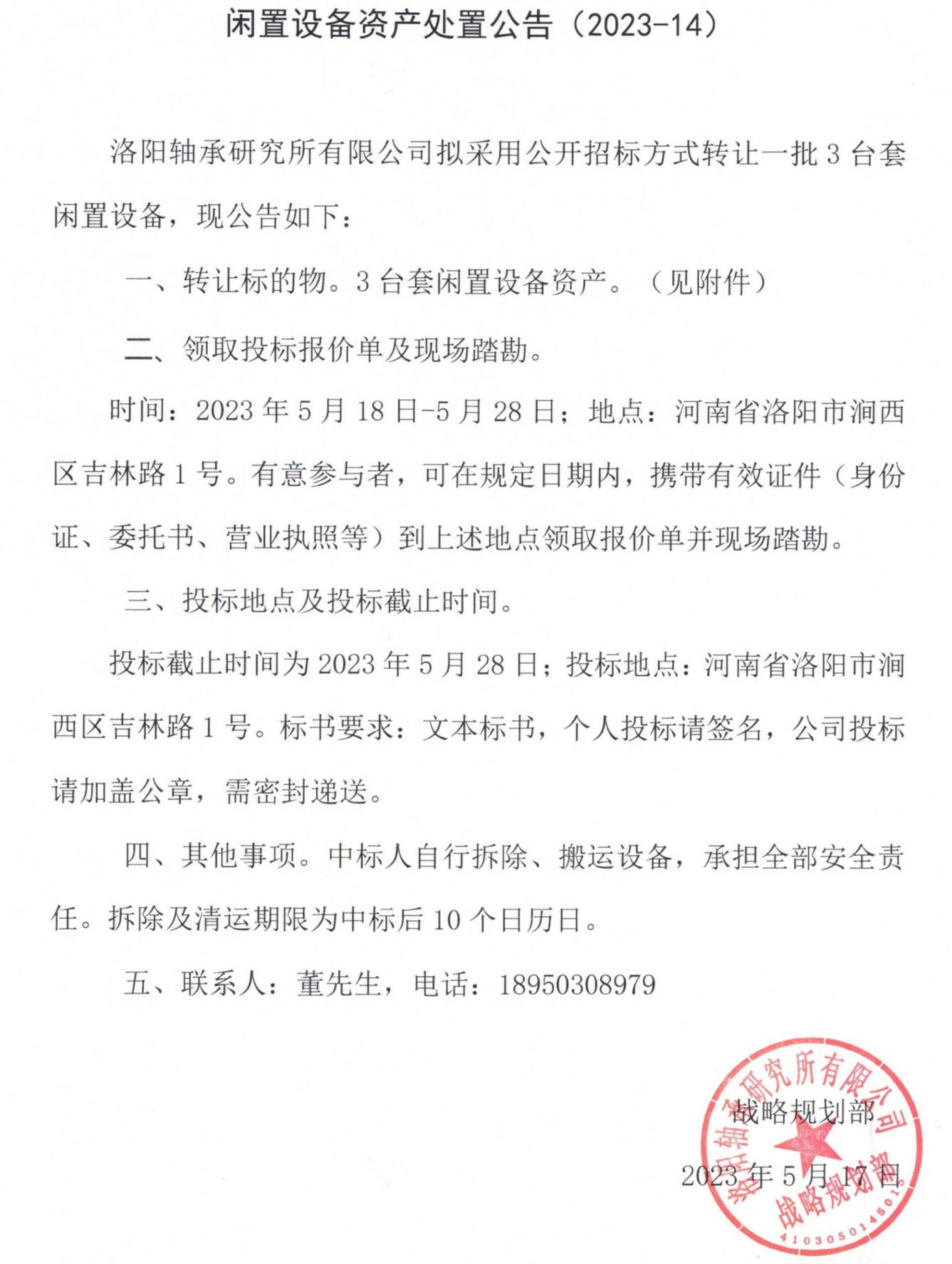 闲置设备资产处置公告(2023-15)