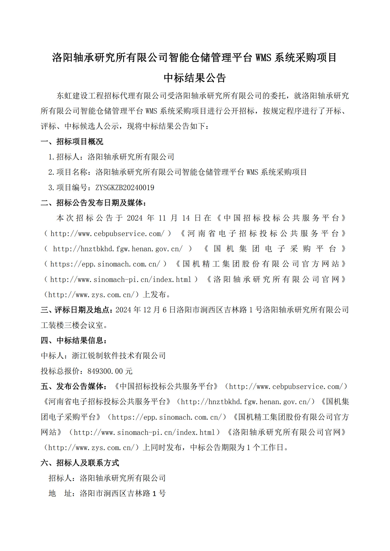 洛阳U8国际轴承研究所有限公司冷辗机床身系统、防护罩组件等设备采购项目中标候选人公示