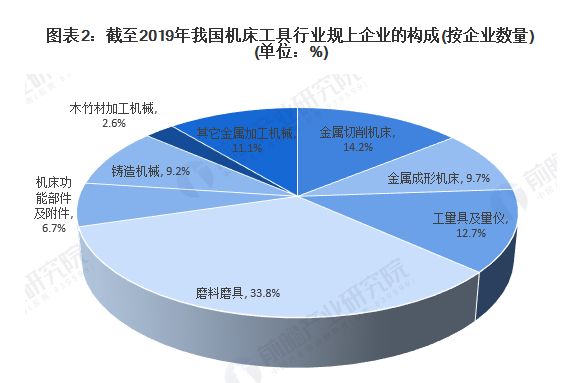 机床工具行业企业结构方面,截至2019年12月,我国机床工具行业规模以上企业总数共5710家,涉及八个分行业,包括金属切削机床、金属成形机床、工量具及量仪、磨料磨具、机床功能部件及附件等。其中磨料磨具企业数量最多,达到1947家,占比达到33.8%,其次金属切削机床企业为816家,占比为14.2%。
