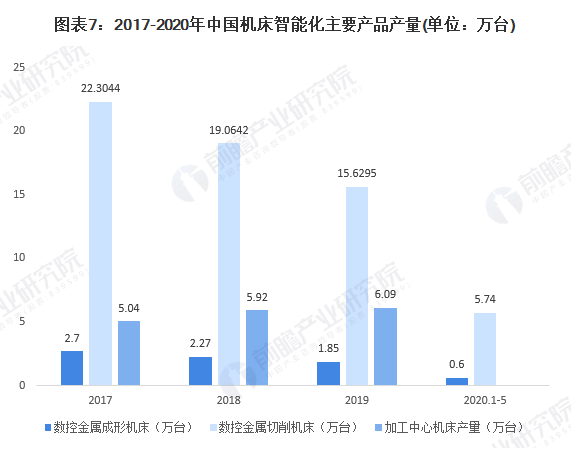 从数量来看,数控金属成型机床、数控金属切削机床数量逐年下降,加工中心机床产品逐渐增加。2019年加工中心机床产量达到6.09万台。加工中心机床是一种多工序复合加工数控机床,并正向高速、高精度和5轴联动方向发展。