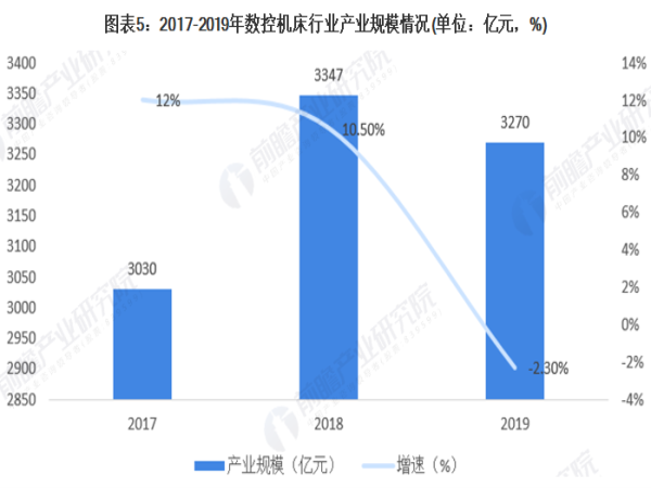 数控机床方面,受数控机床行业整体需求结构调整及升级,下游领域不景气影响,2019年我国数控机床产业规模为3270亿元,同比下降2.30%。