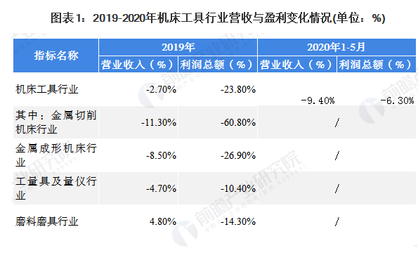 根据国家统计局规模以上企业统计数据,机床工具行业2019年累计完成营业收入同比降低2.7%,利润总额同比降低23.8%。其中除了磨料磨具行业营业收入实现增长之外,其他均下降。2020年1-5月机床工具行业规模以上企业完成营业收入同比降低9.4%。