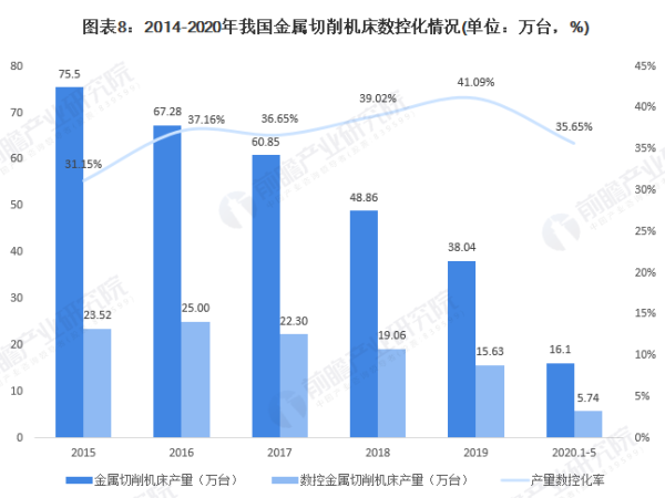 从机床具体数控化率来看,金属切削机床行业是机床工具行业中经济规模最大、地位最显着的产业领域。我国金属切削机床产量数控化率波动提升,从2015年的31.15%上升至2019年的41.09%。随着自动化、数字化潮流的兴起,数控机床得到了快速发展,机床行业数控化率持续提高。