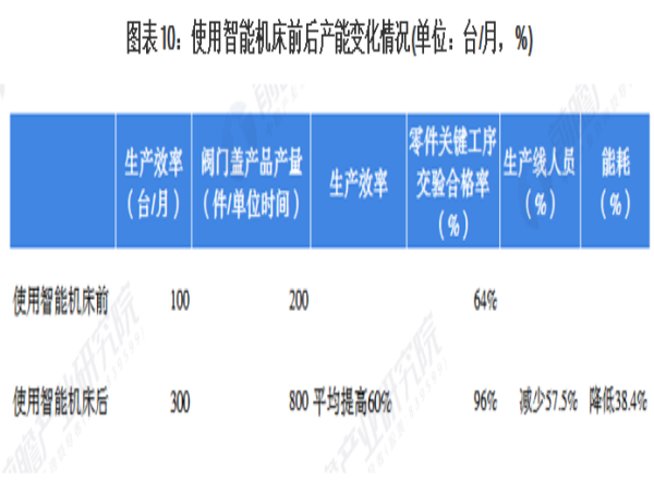 从具体智能机床项目来看,工信部《高档数控车床制造数字化车间的研制与示范应用》项目具有示范意义。该项目关键设备数控化率100%,生产效率由月产100台提高到300台,生产线人员减少57.5%,能耗降低38.4%,零件关键工序交验合格率由64%提高到96%,取得明显经济效益。
